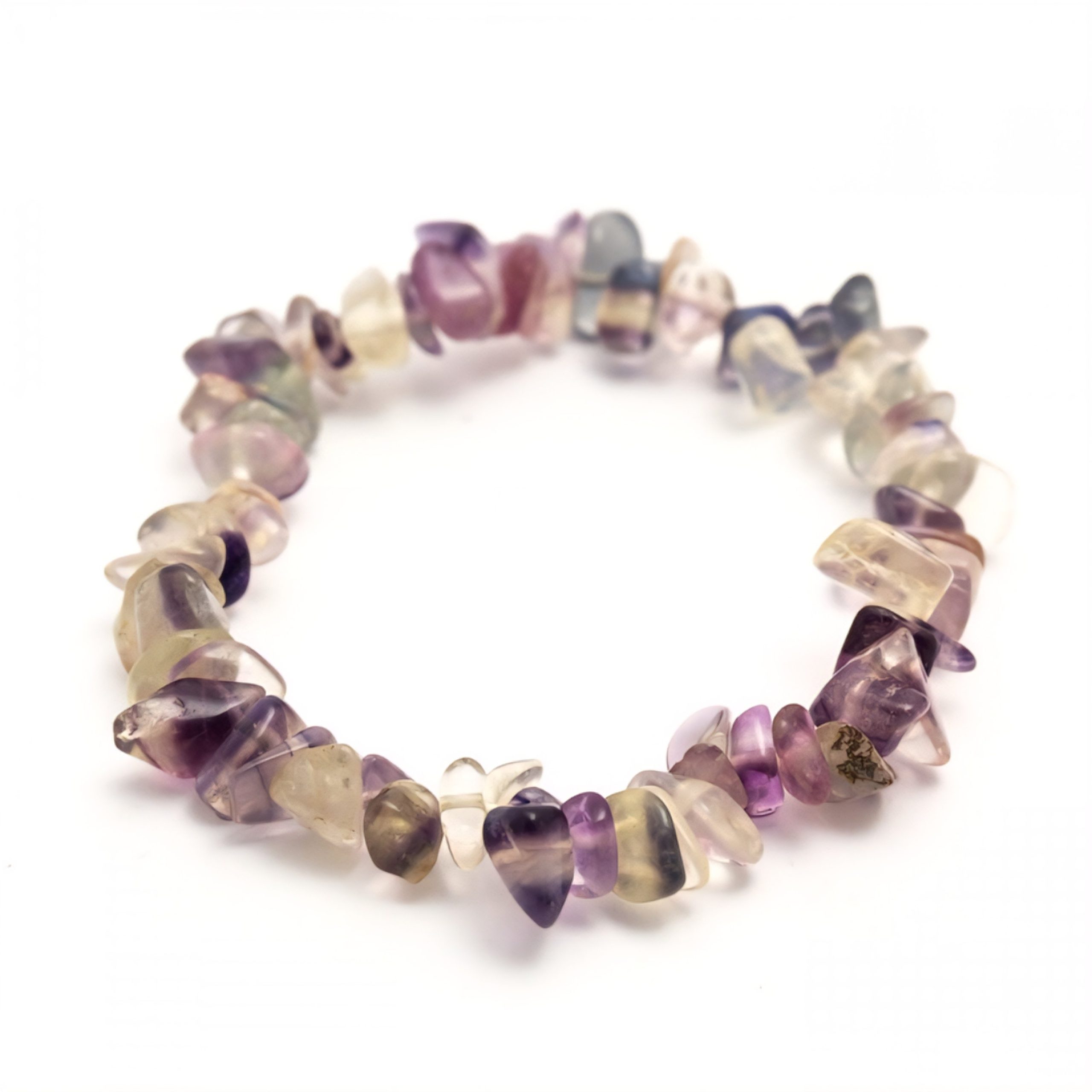 Fluoritt er en fantastisk krystall på grunn av sitt store utvalg av farger i lilla, grønn, hvit og klar. Disse fluorittbitarmbåndene har en tendens til å se mer lilla ut på avstand, men inneholder også de andre fargene i ulik grad. Et armbånd av god kvalitet.