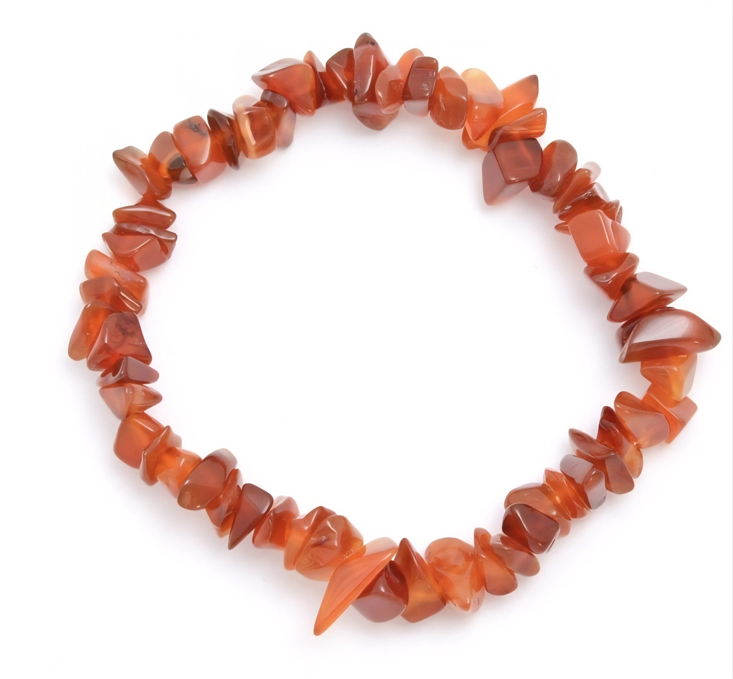 Krystallchip-armbånd er små krystallbiter som har blitt tromlet til de er glatte, og deretter tredd sammen på en strikk. Karneol-armbåndene kan variere i fargen avhengig av hvilken type karneol som brukes, men det er vanligvis ganske likt bildet ovenfor.